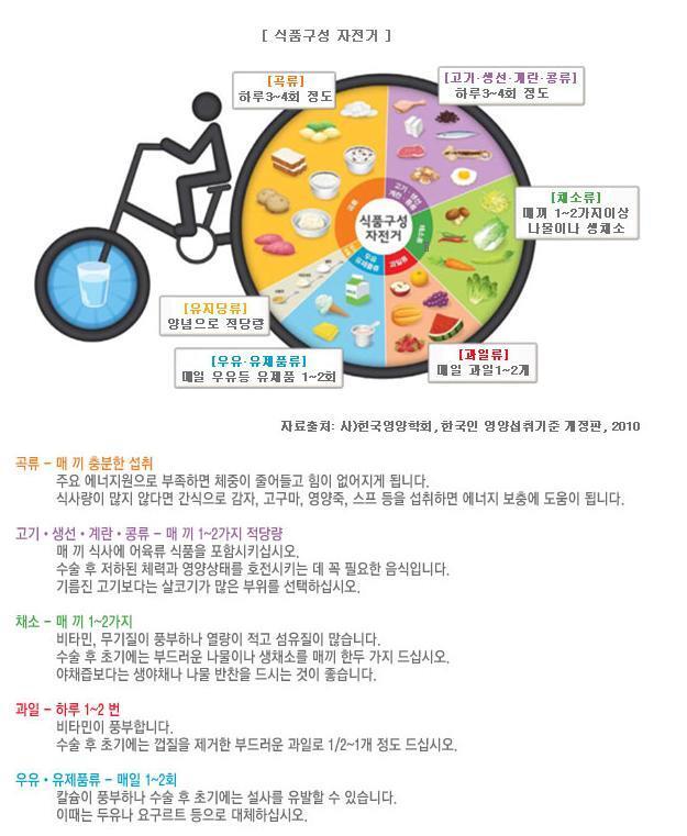위에서 소개한 식생활 지침을 구체적인 행동에 연결하는 그림을 소개합니다. 원하는 식사의 조합이나, 무엇을 얼마나 먹으면 좋을까 고민하는 대중들을 위해 각 식품군의 대략적인 양이 표현되어 있습니다. 알기 쉽게 그림으로 나타낸 한국 영양 학회에서 제공하는 식품 자전거 이미지입니다.