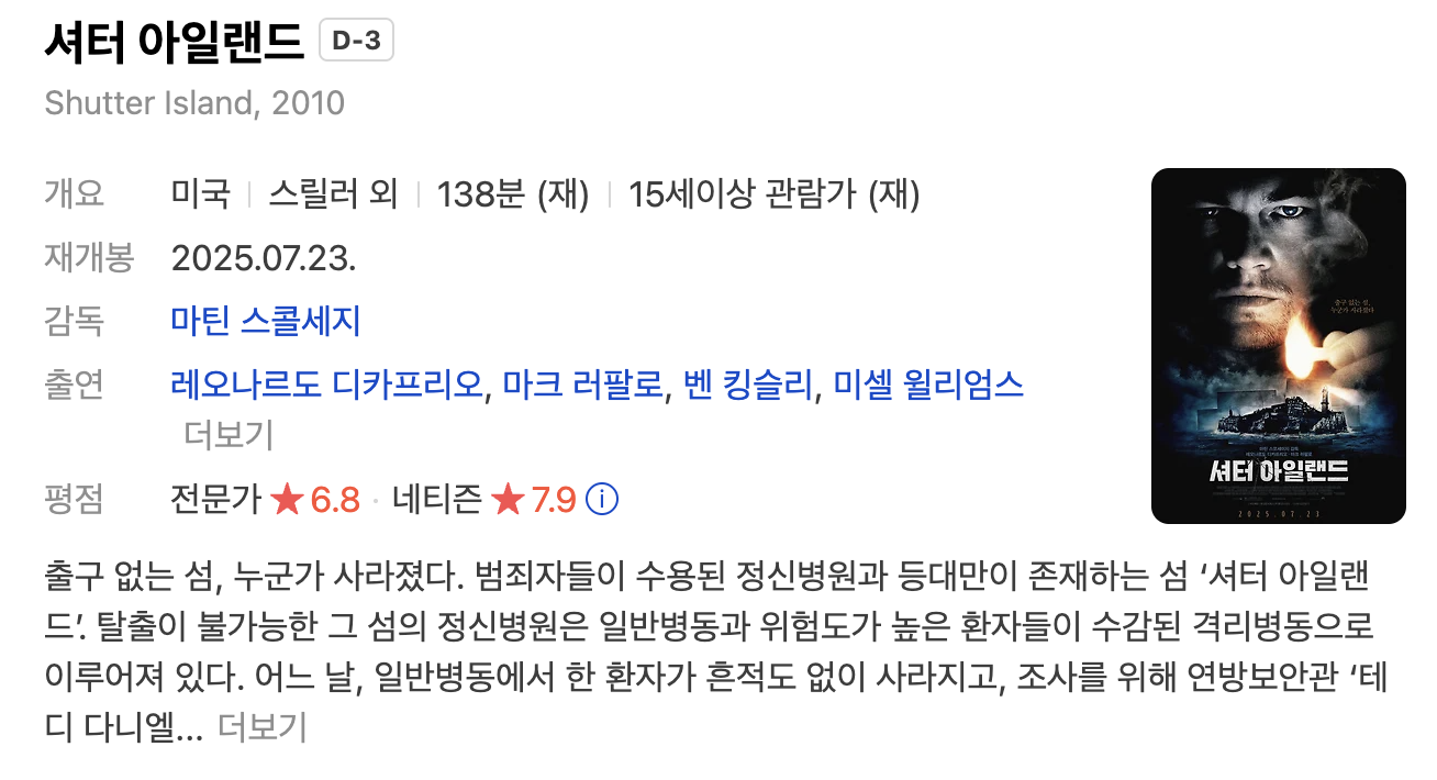 깊이 있는 서사와 숨 막히는 반전으로 가득 찬 이 명작을 극장에서 다시 만날 기회를 절대 놓치지 마세요. 지금 바로 가까운 극장에서 '셔터 아일랜드' 예매 정보를 확인하고, 잊지 못할 영화적 경험을 예약하세요!