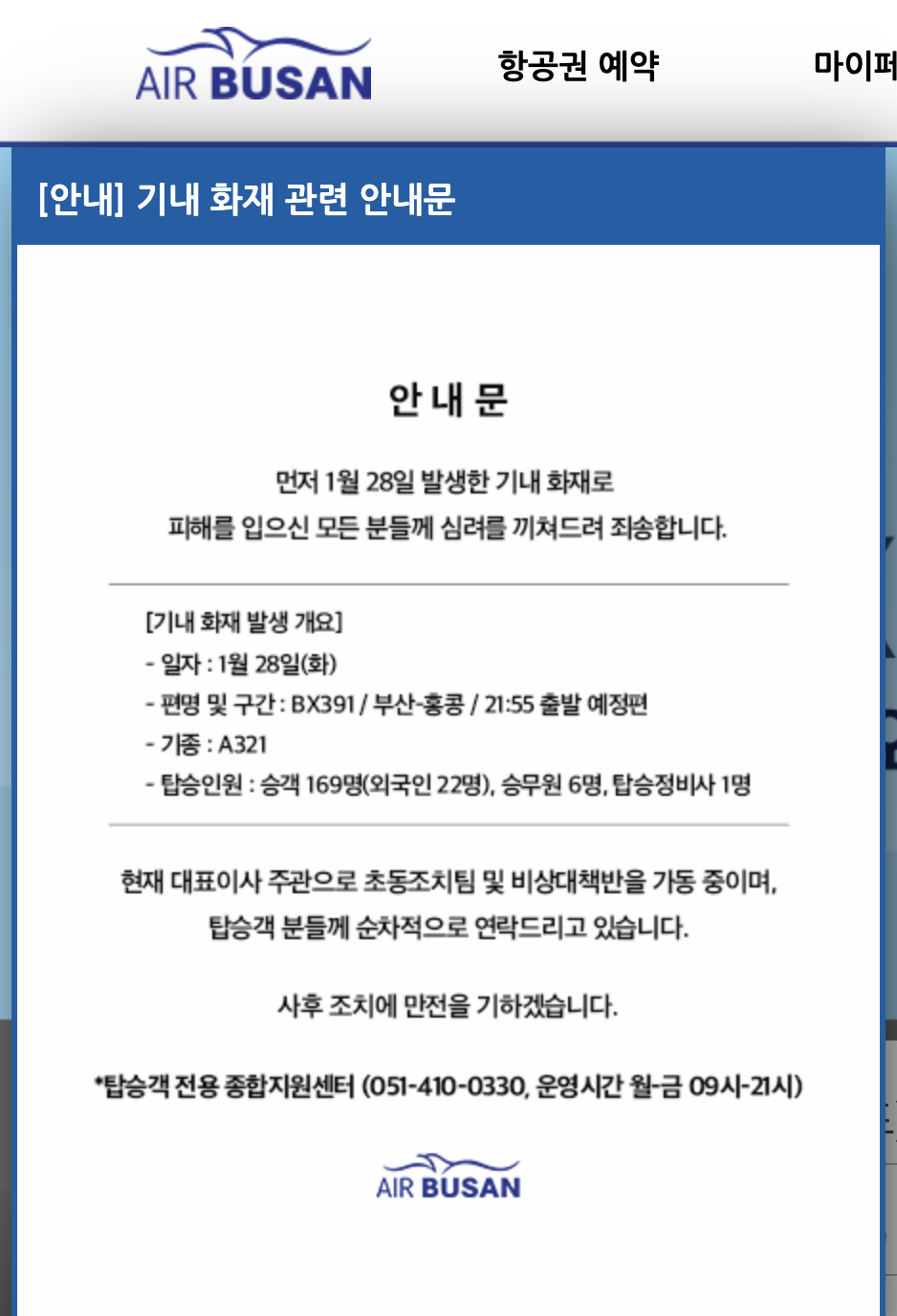 에어부산은 사고 발생 후 다음과 같은 승객 지원 조치를 실시했습니다: