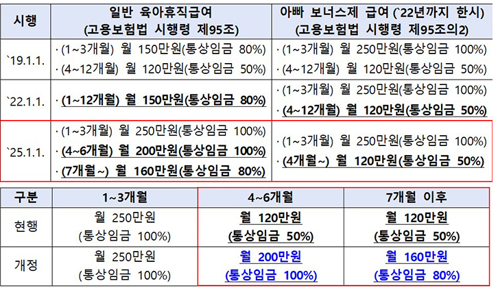 💡 하지만 이번 '고용보험법 시행령' 개정으로 이러한 불균형이 해소되었습니다. 이제는 4개월 차 이후에도 일반 육아휴직 급여와 동일한 수준의 금액을 보장받게 됩니다. 변경된 내용은 아래 표를 통해 쉽게 확인하실 수 있습니다.